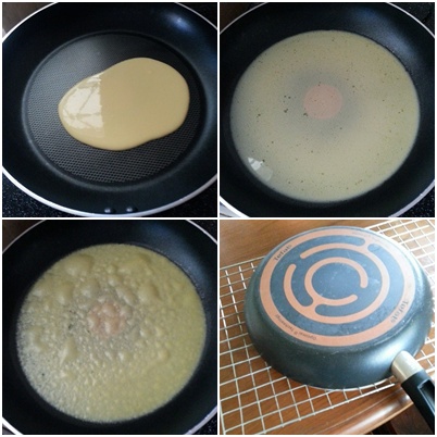 10. นำแป้งลงทอดใสกระทะเทปลอน โดยขณะเทแป้งนั้นกระทะต้องไม่ร้อน หากกระทะร้อนจะไม่สามารถกลิ้งแป้งให้เป็นแผ่นได้ แป้งที่สุกแล้วสังเกตจะมีฟองอากาศพองขึ้นมา และขอบเริ่มแห้งให้ใช้ตะหลิวแซะขอบให้รอบ เสร็จแล้วคว่ำกระทะลงบนตะแกรงพักแป้ง แป้งก็จะหลุดออกมาเป็นแผ่นเอง