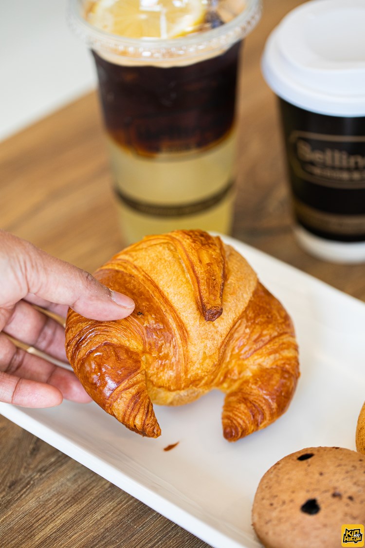 “ครัวซองต์เฮอริเทจ” กลิ่นหอมมากๆ ตัวนี้จะเป็นครัวซองต์พรีเมี่ยมนำเข้าจากฝรั่งเศส แป้งบางกรอบ พับซ้อนกันเป็นเลเยอร์จนสวย ฉ่ำเนย ตอนออกจากเตาอบจึงได้กลิ่นหอมชวนหิวเอามากๆ เป็นครัวซองต์สไตล์ต้นตำรับแท้ๆ