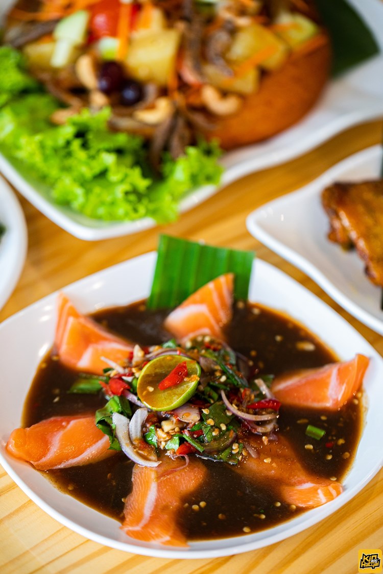 นัวกันต่อกับอีกหนึ่งเมนูยอดฮิตสีส้มๆสดโดนใจแบบนี้ไม่ต้องบอกชื่อเมนูก็พอจะเดาออกกันแล้วใช่มั้ยหละ “ยำแซลมอนน้ำปลาร้า”แซลมอนหั่นมาชิ้นโตหนามาก ยำนัวๆราดด้วยน้ำปลาร้าสูตรเด็ดของทางร้าน นัวจนซึมเข้าเนื้อแซลมอนฉ่ำๆสดๆคือดีจริง