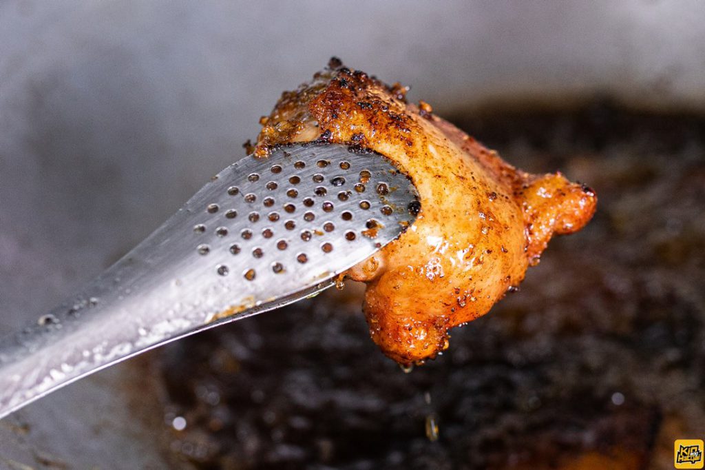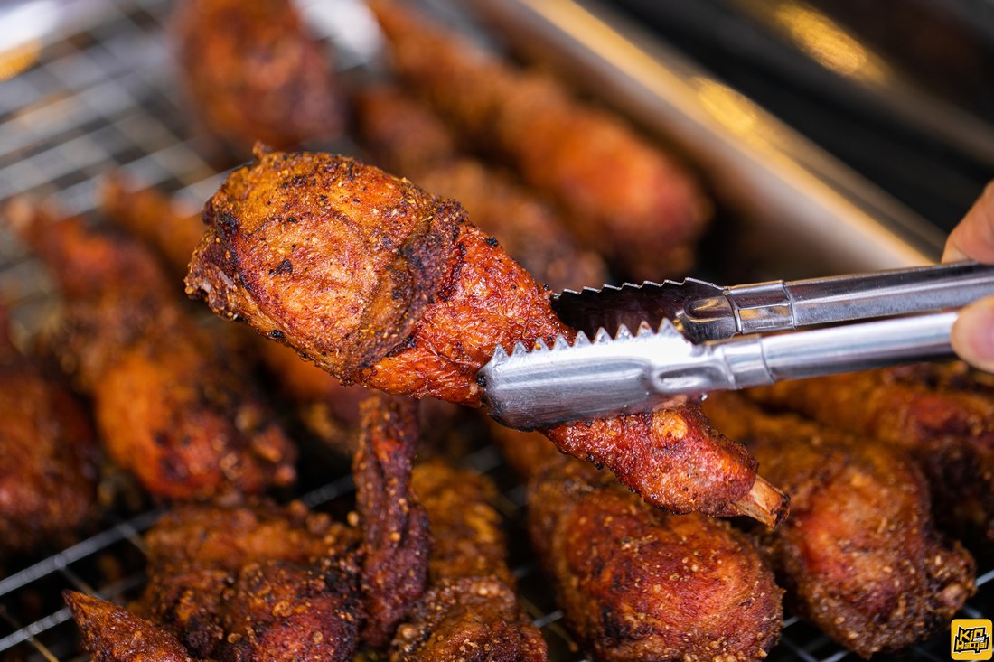 ทอดกันร้อนๆ ทอดกันเรื่อยๆ ทางร้านนจะทอดทั้งหมด 2 กระบวนการคือทอดให้สุกก่อนและนำขึ้นพัก จากนั้นจะนำไปทอดให้กรอบจ้า และที่ต้องอธิบายกันเลยว่าไก่ทอดของทางร้านนี้ สีจะคล้ำกว่าร้านอื่น เพราะได้ใช้เครื่องเทศสูตรเฉพาะหมักข้ามคืนนานถึง 2 วัน และใช้เครื่องเทศผสมในแป้งอีกครั้งทำให้มีสีที่ค่อนข้างต่าง แต่บอกเลยว่าอย่ามองแค่หน้าตาต้องลองที่รสชาติ
