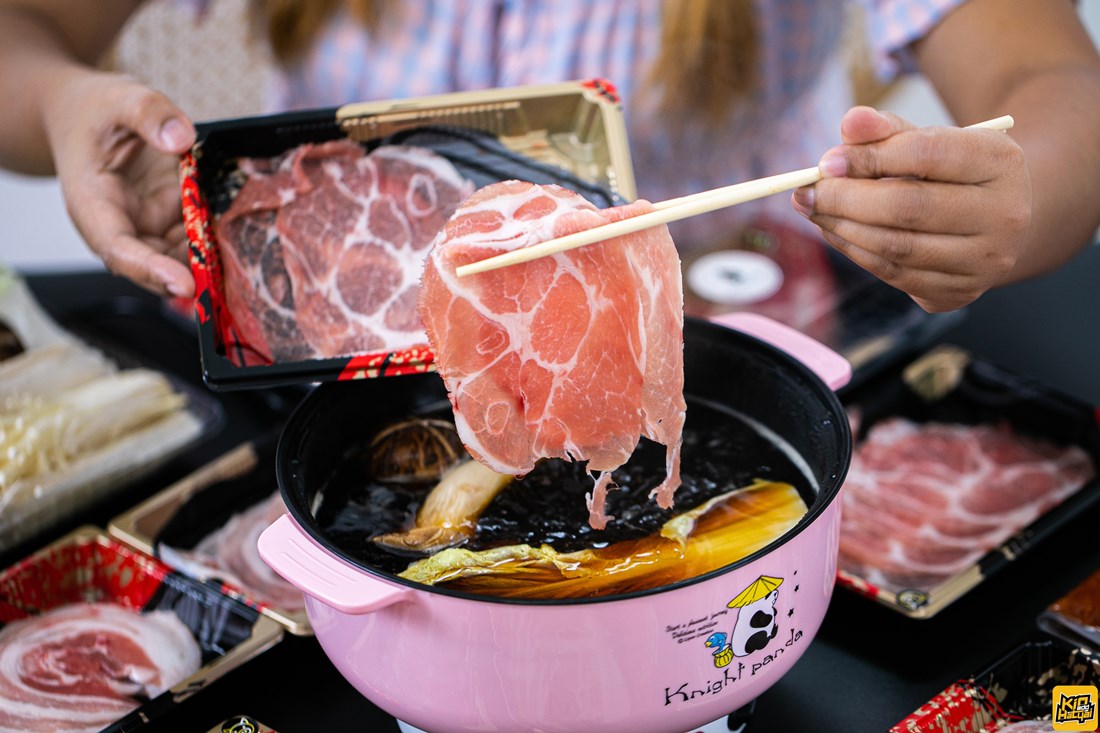 ดูหมูที่ให้มาสิจ๊ะ ลายสวยงามมากจ้า สไลซ์มากำลังดีเลย ซ้ายจะเป็นหมูคุโรบุตะกับเบคอน ส่วนขวาคือหมูเด้งชีส บอกเลยว่าเด็ดมาก เห็นชีสที่แทรกอยู่ในหมูเด้งนั่นมั้ย ตอนจุ่มลงในหม้อคือฟินมากๆ หมูเด้งๆกับชีสยืดๆ ต้องลองๆ