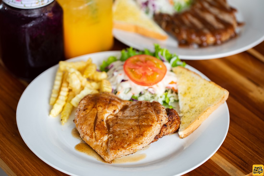 มาเริ่มกันด้วยสเต็กสันคอหมู ในจานนี้ให้สันคอมาถึงสองชิ้น ราดด้วยซอสเกรวี่ เสิร์ฟพร้อมเฟรนด์ฟราย สลัดและขนมปังกระเทียม เล่นเอาอิ่มตั้งแต่จานแรกเลยนะเนี่ย ถัดมาเป็น สเต็กอกไก่พริกไทยดำ อกไก่ที่ให้มาชิ้นใหญ่ๆ ถูกใจสำหรับคนรักอกไก่โดยเฉพาะ กินกับเฟรนด์ฟราย ผักสลัดและขนมปังกระเทียมแค่นี้ก็อิ่มทองแล้วจ้า