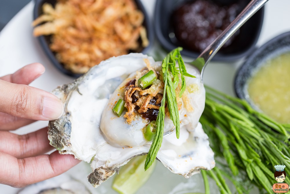 ออเดิร์ฟเบาๆสำหรับเราและเธอ “หอยนางรมสด” ตัวโต๊โต มาพร้อมเครื่องเคียงที่มีทั้งน้ำจิ้มซีฟู๊ดและน้ำพริกเผา หอมเจียว พริกซอยกระเทียม กระถิน และมะนาวสดๆไว้บีบเพิ่มความซี๊ด ให้ปรี๊ดปร๊าดดด ใส่เครื่องเคียงทุกอย่างลงไป เข้าปากเต็มคำ สัมผัสถึงความหวานของเนื้อหอย สดแบบเต็มคำ